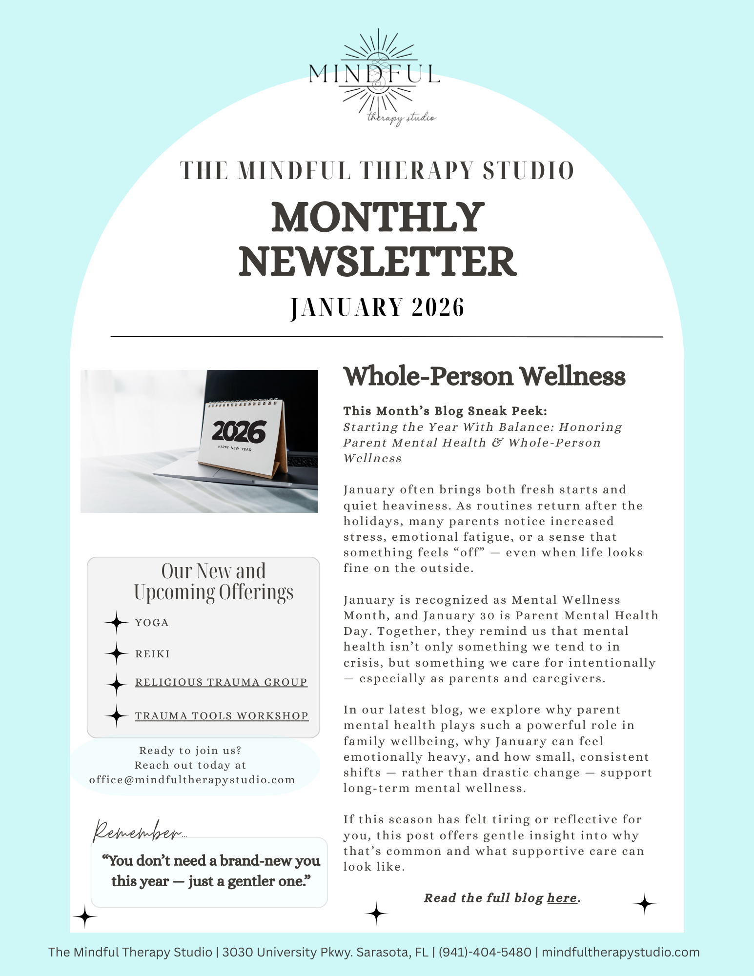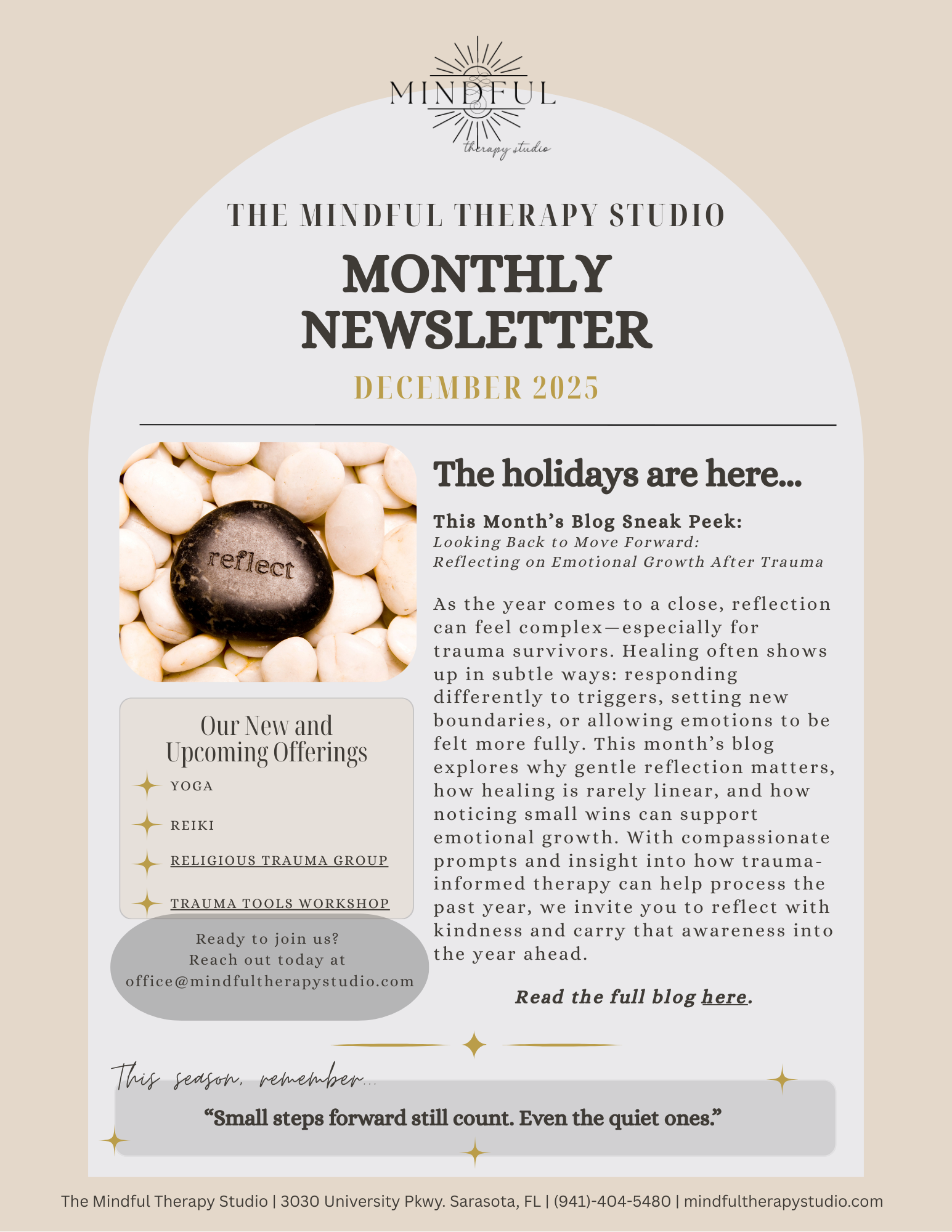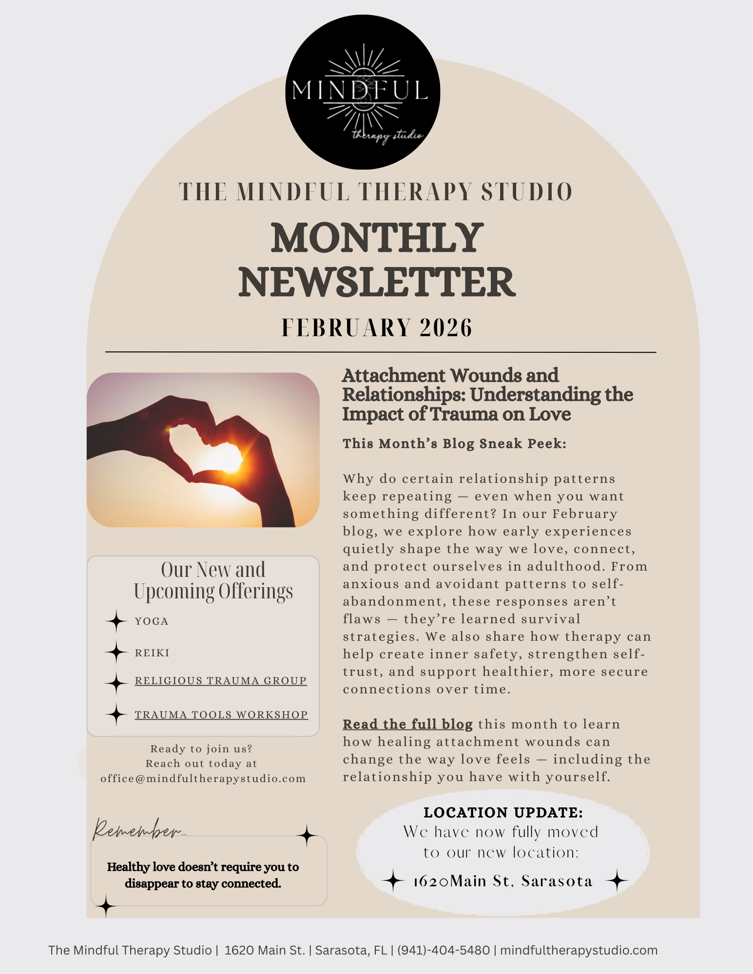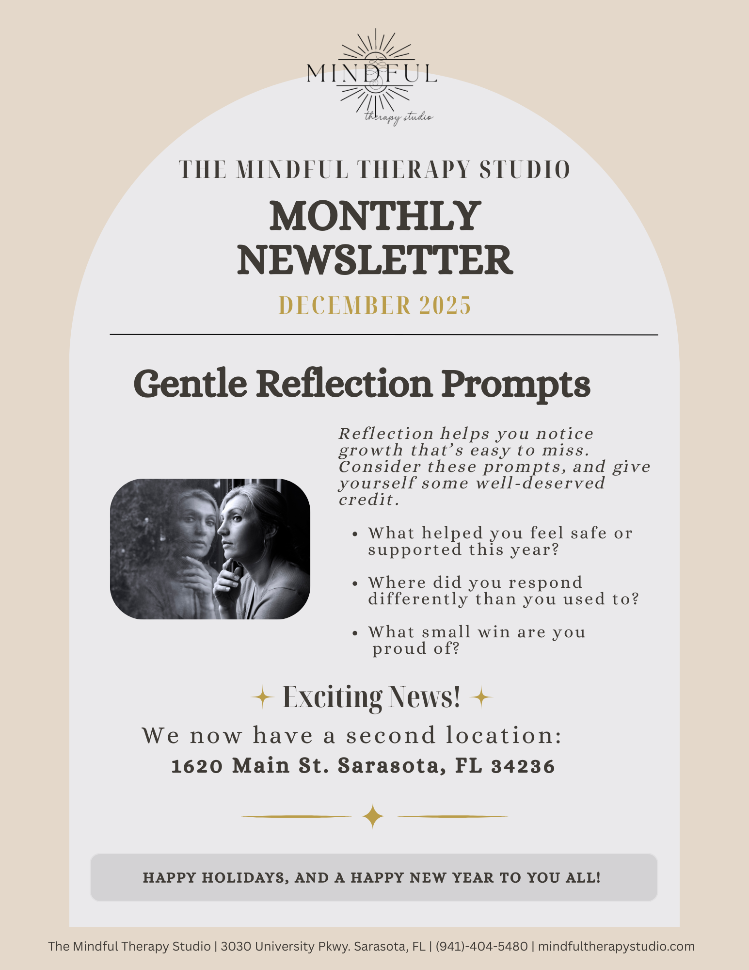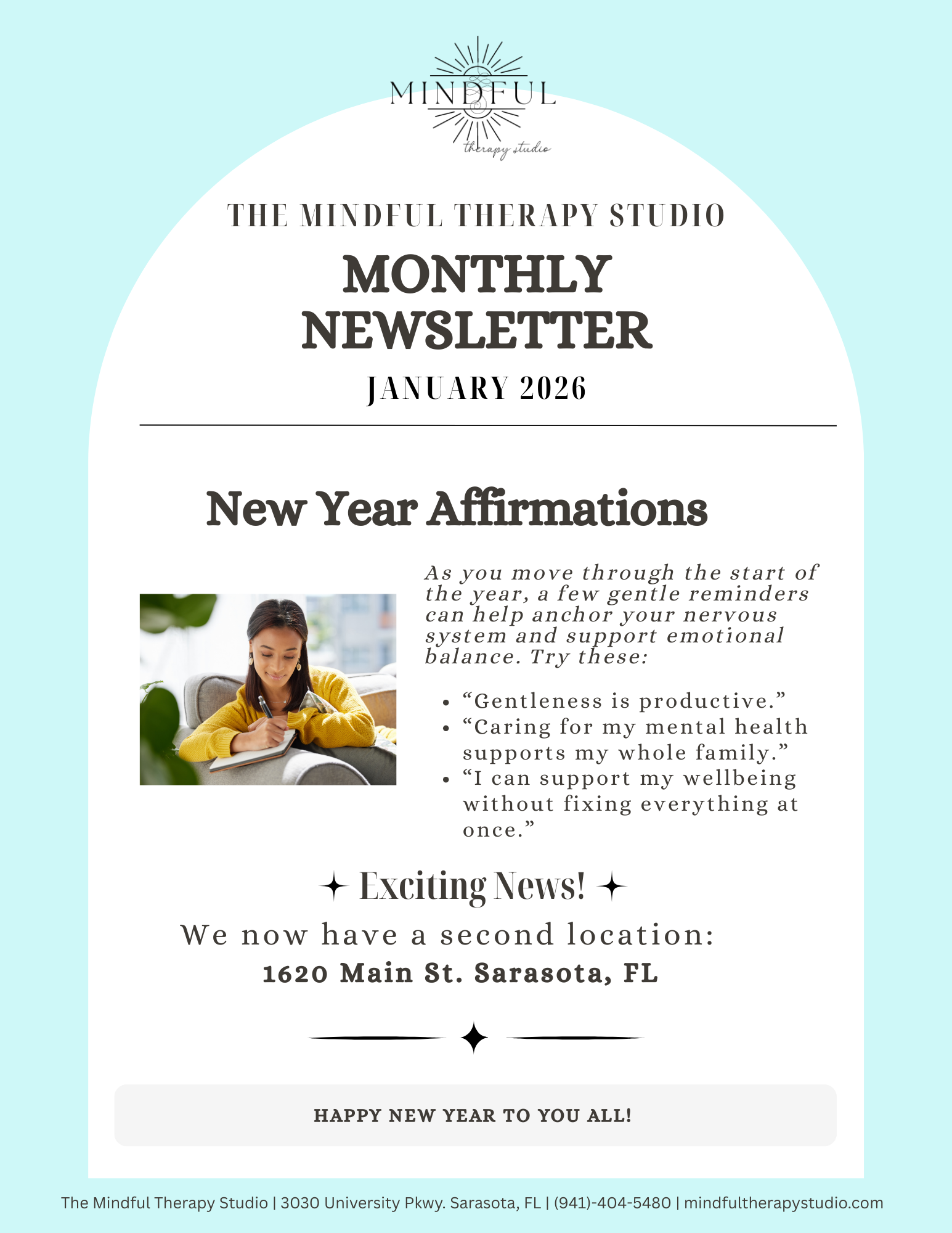 Subscribe to our NewsletterLearn more about our services, gain practical mental health tips and insights, and stay up to date on what’s new at The Mindful Therapy Studio in Sarasota, FL!